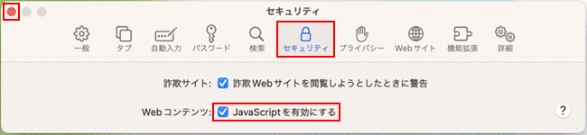 2.「セキュリティ」タブにある「Webコンテンツ」設定で「JavaScriptを有効にする」のチェックを有効にし、左上のクローズボタンをクリックします。